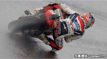 初日最初のフリー・プラクティス1ではカタールに続きトップタイムを飾ったケーシー・ストーナーだったが、雨のセッティングはまだリアまわりに課題があるようだ。