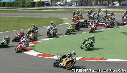 シグナルが消え、勢いよく飛び出したフロントロースタートのライダー4名が1コーナーに飛び込んだ。後続のライダーも次々と飛び込み、約30台のバイクが団子状態になる。