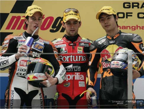 ホルヘ・ロレンソが写真判定0.016秒差で高橋裕紀を抑えれば、最終ラップでマルコ・シモンチェリが2つポジションを上げて6位。