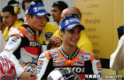 パルクフェルメではアルベルト・プーチが温かくペドロサを迎え、その横には昨年の250cc時代のチームメイトであり、今回の中国GPを3位表彰台で終えた青山博一選手もペドロサの祝福に訪れた。