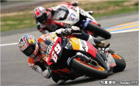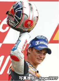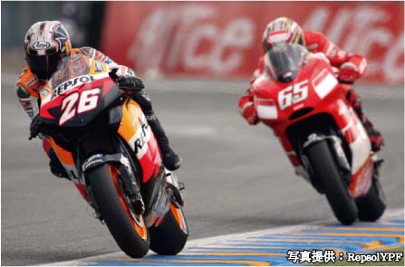 従来からのロッシの勝ちパターンである完全単独勝利を誰もが確信した時、コーナーを先頭で走り抜けてきたバイクはキャメルヤマハの46番ではなく、レプソルカラーの26番だった。後方には自らコースアウトして他のバイクを避ける黄色のバイクがうなだれるように走っている。バレンティーノ・ロッシのバイクからはエンジン音が全く聞こえていない。エンジンの故障だ。